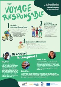 L’affiche Mon voyage responsable apporte des éléments de réponses à tous les jeunes qui souhaitent concilier projet l’étranger et protection de la planète. Parmi les idées proposées : limiter son empreinte carbone, s’engager dans un projet « vert », revoir ses habitudes de consommation.
