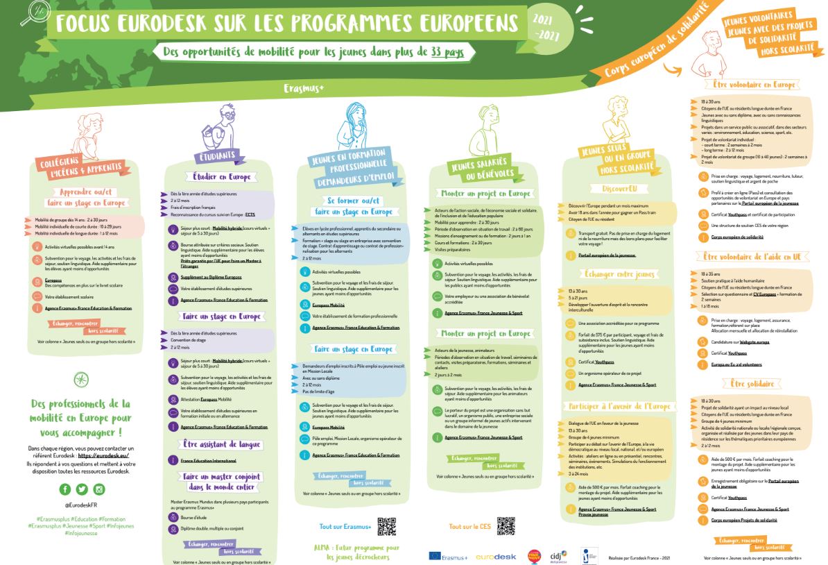 Focus Eurodesk sur les programmes européens présente les opportunités de mobilité pour les jeunes proposées dans le cadre des programmes Erasmus+ (2021-2027) et du Corps européen de solidarité. Avec son entrée par profil, cette affiche permet de visualiser en un clin d’œil les différentes possibilités pour bouger à l’étranger.